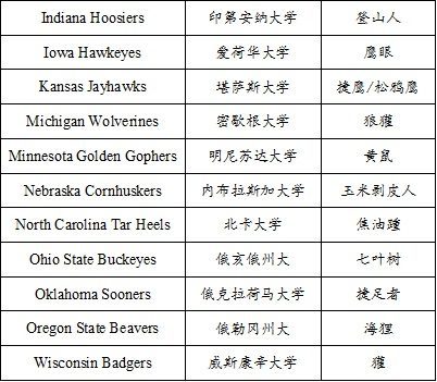 在美国的各大体育联盟中,这一类使用“地区人名”作球队名的情况非常常见,尤其是在NCAA。下表列出了一些大学球队的名称和常用译名,实际上,这些队名都兼有“某某州人”的意思。