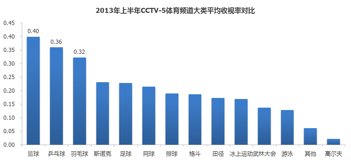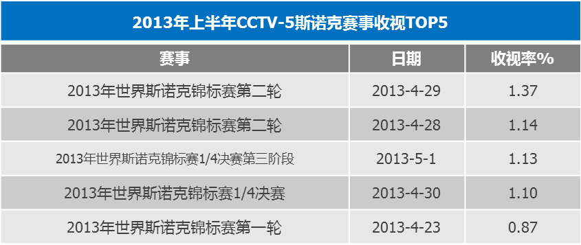 作为一个小众化的体育运动,2013年上半年CCTV-5播出的斯诺克赛事平均收视率达到0.23%,在所有赛事中排名第4,仅次于篮球、乒乓球和羽毛球,甚至高于足球电视转播赛事(见下表)。而在此之前,2011年的中国公开赛,丁俊晖VS特鲁姆普的比赛电视转播,更是创下了当年央视体育频道收视率第一的纪录。