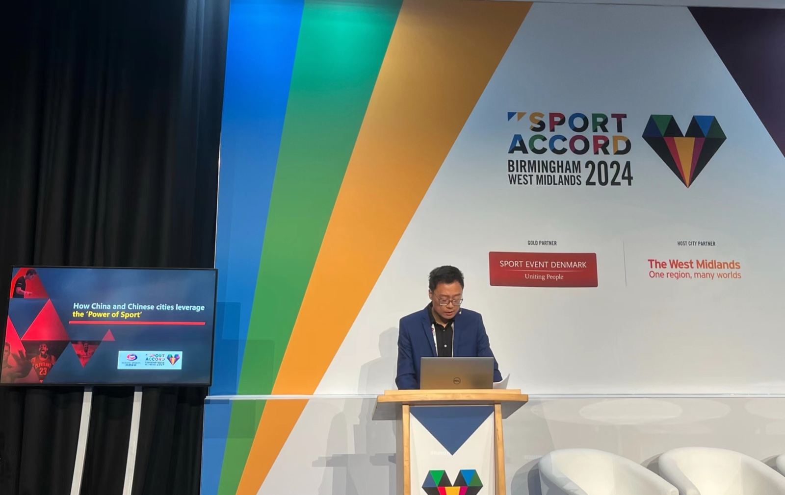 世界羽联秘书长托马斯·伦德在2024年世界体育大会现场向中国体育迷发出问候